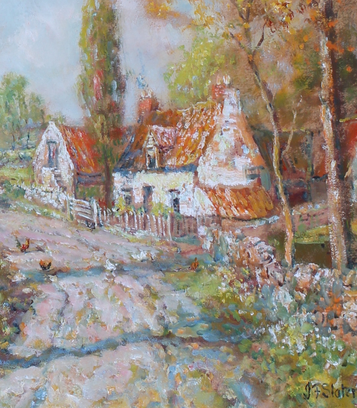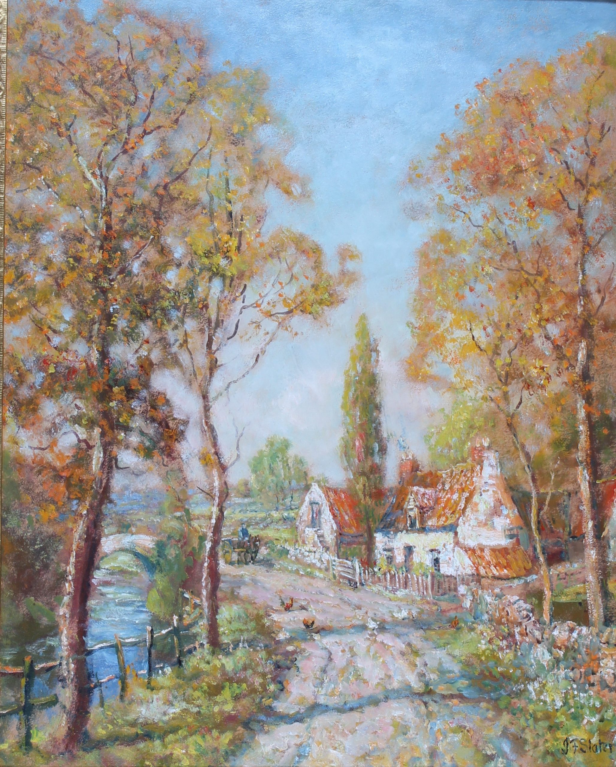 John Falconar Slater was a Newcastle born artist who painted a wide range of subjects in oils and watercolours exhibiting prolifically in the North East of England. Initially Slater worked as a bookkeeper for his father’s corn mill and then, having emigrated at 20, ran a store in the diamond fields of South Africa. Returning to the Northumberland he turned to art as a career. J.F. Slater could well be one of the best Northern Impressionist artists and he was expert at depicting the many moods of the North Sea. It is reported that he was often seen clad in oil-skins, his easel tied to rocks and weighed down by stones, so he could paint in all weathers. Indeed, the blue plaque that honours him and commemorates his time lived in Cullercoats (St. Oswins Avenue) cites that he was, “known as the ‘weatherproof artist’ for his practice of painting outdoors in all conditions.” John Falconar Slater was a member of the Bewick Club, the President of the North East Art Club, based in Whitley Bay, and a leading member of the Cullercoats Colony. Slater exhibited widely on Tyneside, Walker Gallery, Liverpool, (5) and Manchester City Art Gallery (1) and exhibited 22 works at the Royal Academy. Today his works are held, among others, by the: Laing Art Gallery; Shipley Art Gallery; Government Art collection; National Maritime Museum; South Shields, Sunderland, Lancaster, Museums.